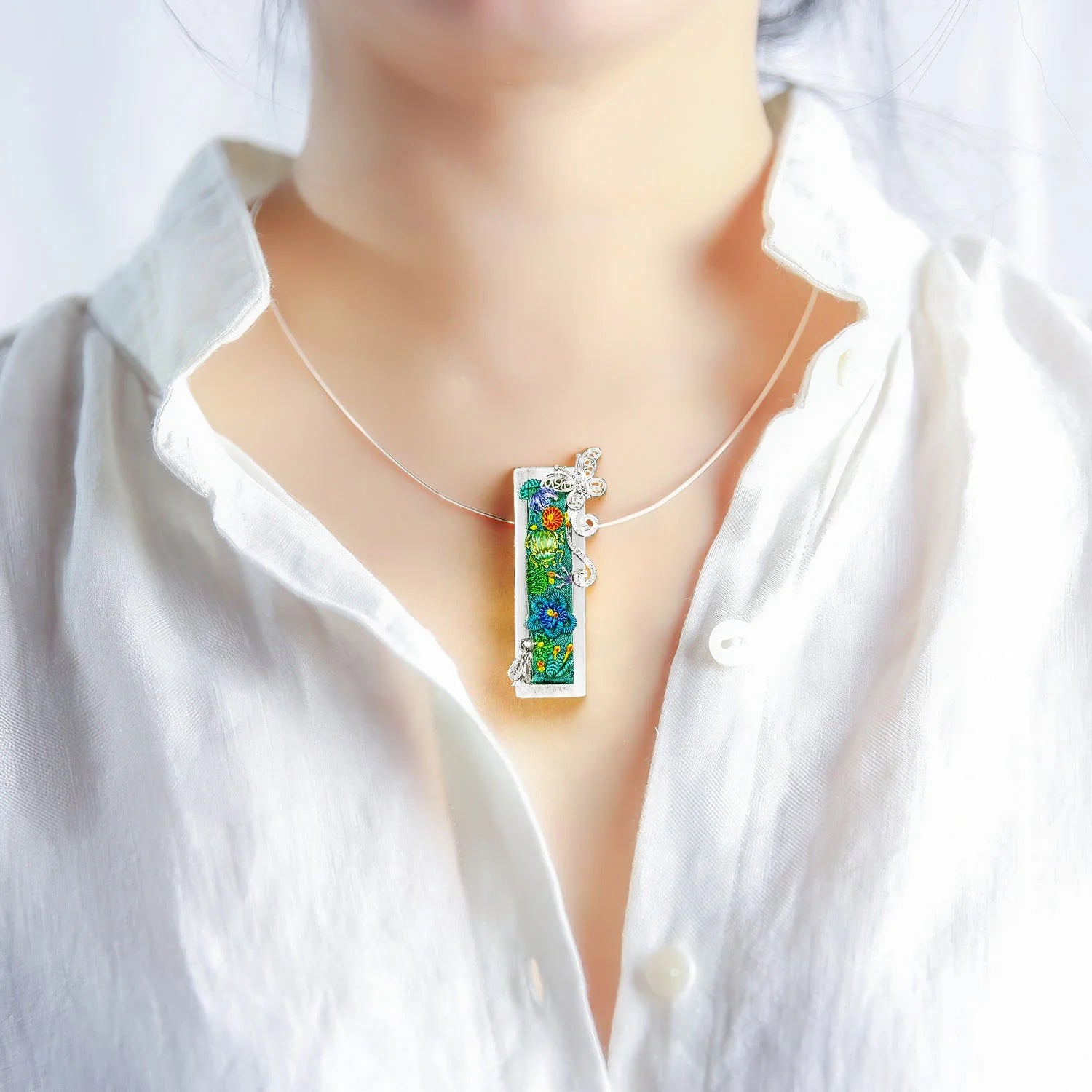 Elevate your style with this exquisite handmade rectangular pendant necklace. Combining delicate handcrafted silver and hand embroidery, this elegant necklace exudes sophistication and timeless appeal, making it the perfect addition to any jewelry collection.
