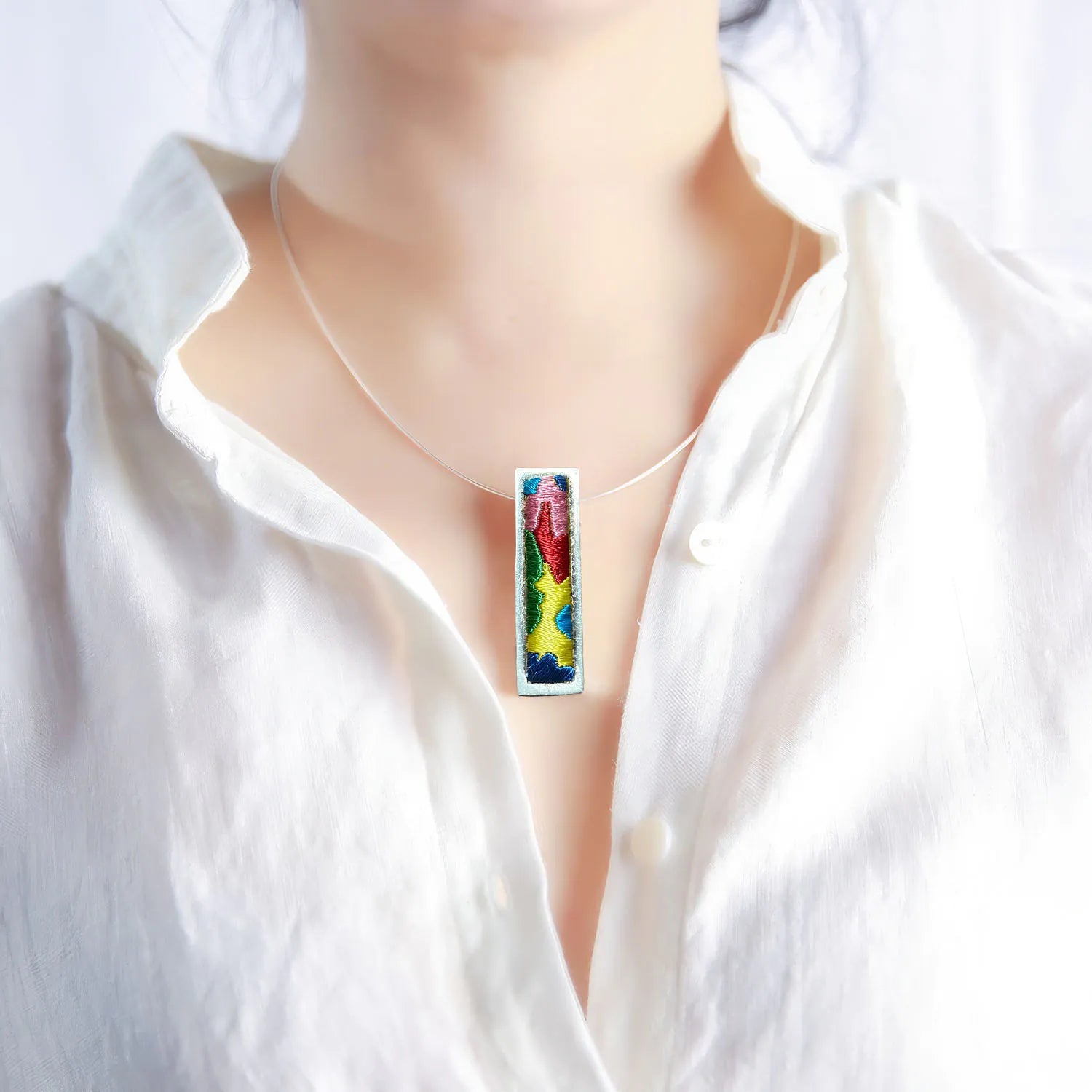 Silver Rectangular Embroidered Abstract Jungle Pendant Necklace